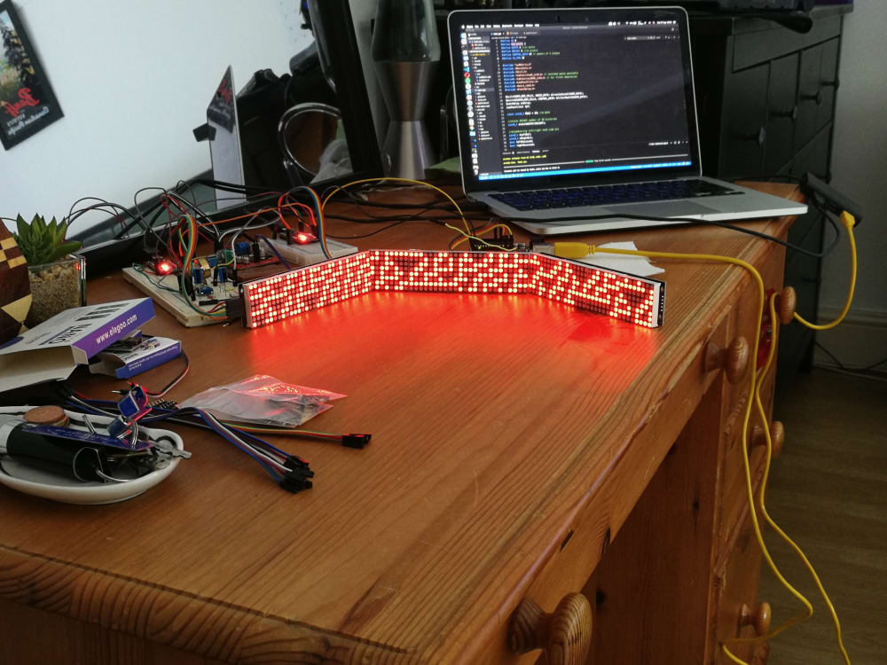 I love it when simple rules manifest chaotic and complex behaviour. Cellular Orchestra is a computational art installation consisting of sound and light emitting creatures, who communicate with each other and respond to their own portion of a communally-generated cellular automaton. For this project I used a 1D automaton, running on 4 Arduino Nanos, visualised using LED matrixes and sonified using the Mozzi library.